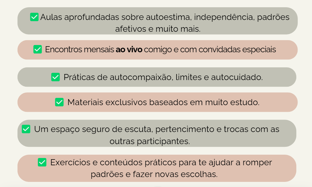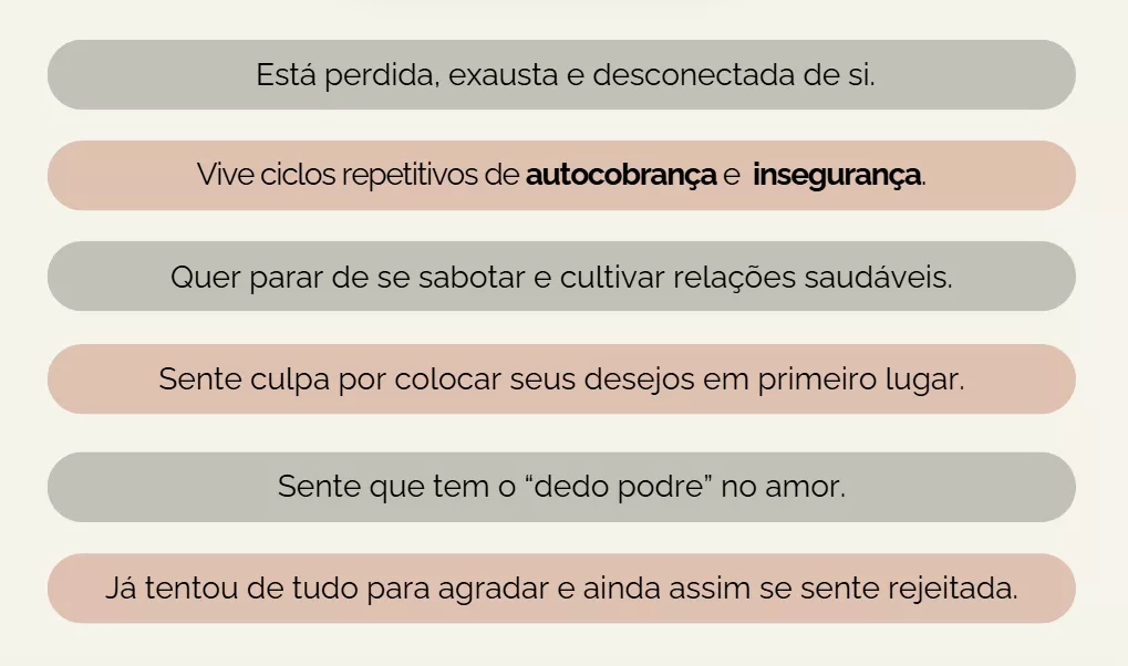 Produto exclusivo para mulheres que se sentem inseguras, ansiosas e com medo de ficar sozinhas, que vivem relacionamentos instáveis, repetitivos ou emocionalmente exaustivos, que se anulam para serem amadas e têm dificuldade de colocar limites, que querem parar de depender emocionalmente dos outros, que desejam viver relações mais leves, com reciprocidade, e sem medo de se perder no outro e principalmente: que desejam se fortaleceror , construir autoestima e assumir o protagonismo da própria vida.