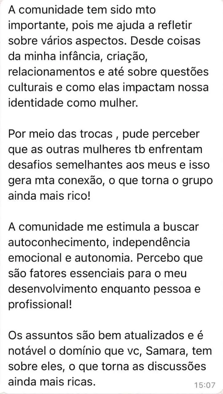 Uma comunidade criada exclusivamente para mulheres que desejam parar de se anular, fortalecer sua autoestima e construir relações mais saudáveis, começando pela relação consigo mesma. Aqui, você encontra suporte emocional, acolhimento, conteúdo profundo e ferramentas práticas para viver com mais coragem, amor-próprio e leveza.